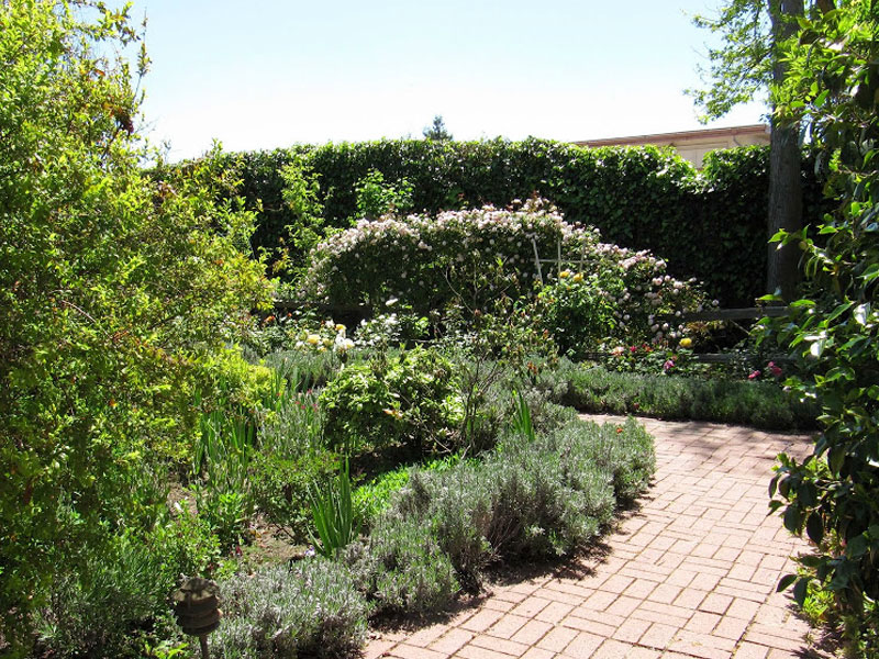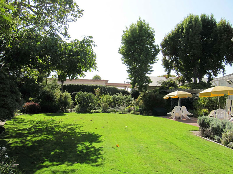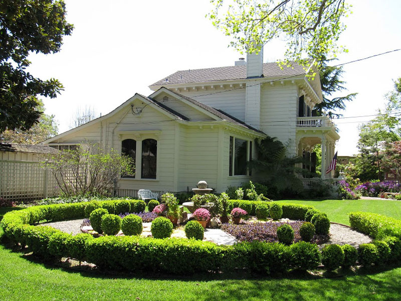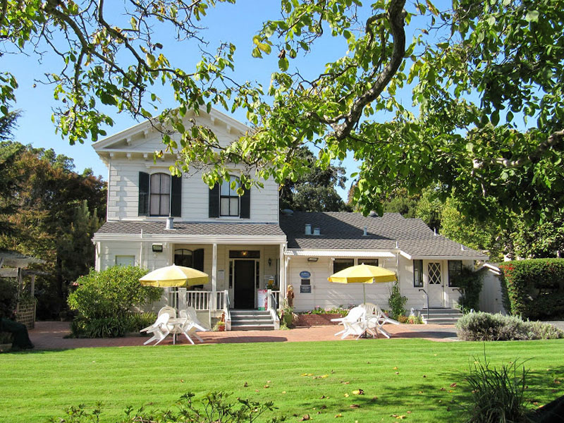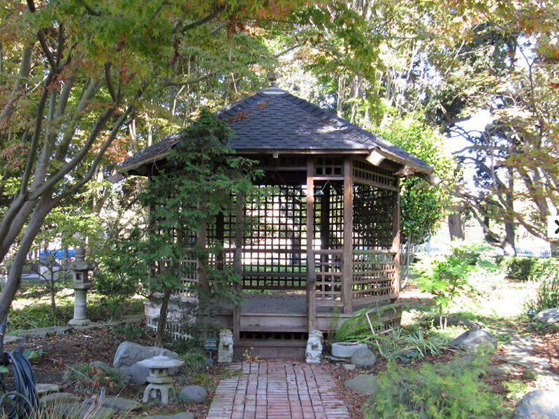 The Bockius-Orr house is sheltered by magnificent, coastal live oak trees that are estimated to be 125 years old. Walk to the right side of the house and you'll find a redwood gazebo surrounded by stepping stones arranged by an artist specializing in Asian landscape design. Follow a dry creek through the garden and you'll see a bell rescued from the Chinatown joss house following a fire in the 1930s that destroyed the local Chinese community, at one time the largest Chinatown outside of San Francisco. Continue on your way to the back of the house and you will pass a lath house and potting shed supporting a 60-year old wisteria. The back garden will delight you with a rose garden, flowerbeds, a spreading English walnut tree, and flowering shrubs that encircle the lawn.